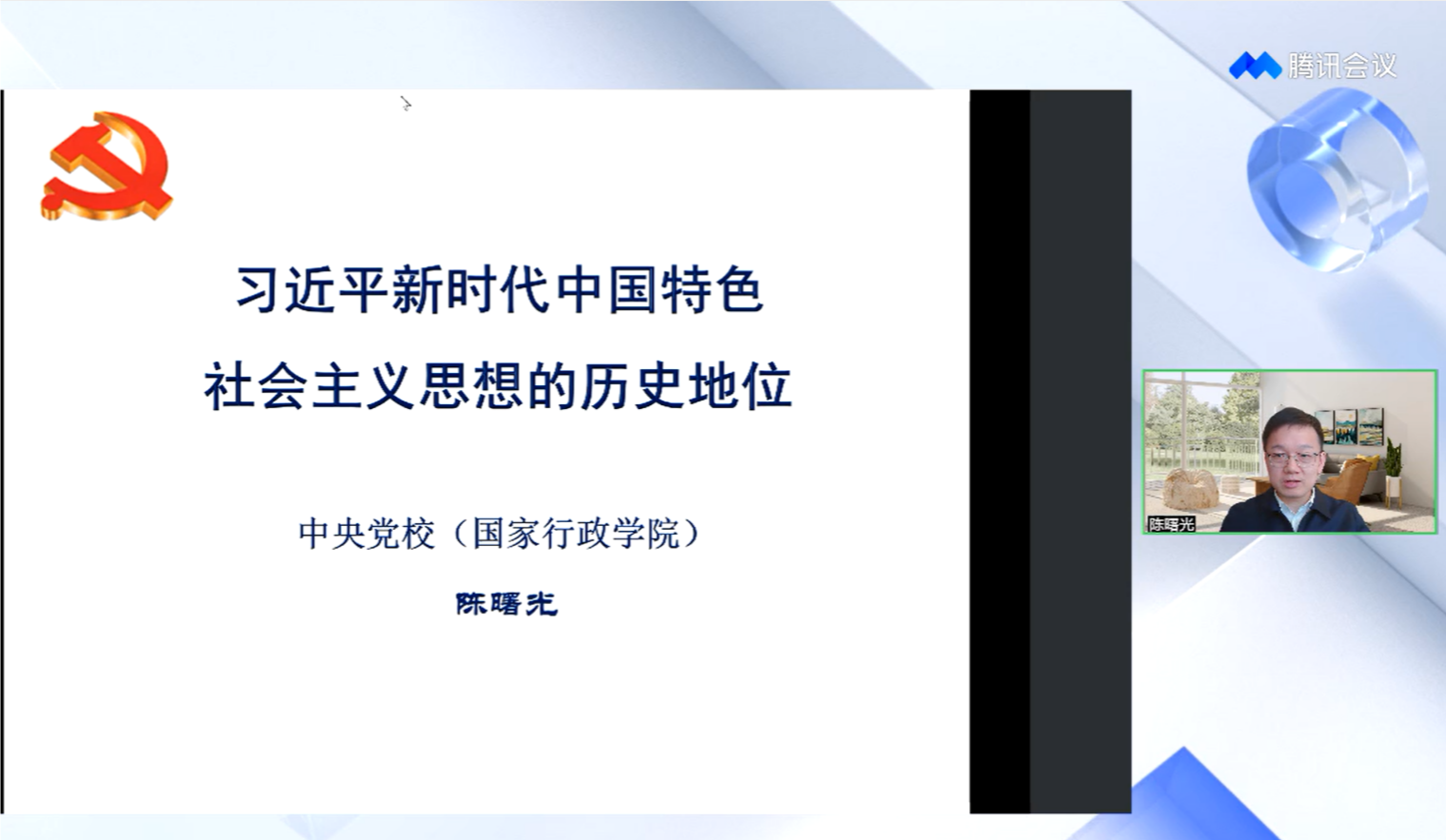 2023年4月22日下午,MG冰球突破官网网站邀请中共中央党校(国家行政学院)陈曙光教授走进我校思政课课堂,作《习近平新时代中国特色社会主义思想的历史地位》专题报告。报告采取“腾讯会议+直播”的形式进行,我校2021级和2022级本科生、校学生党校“求理”分部暨青年马克思主义研修班学员、马克思主义学院师生共同聆听报告。MG冰球突破官网网站党委书记高宁主持报告会。
