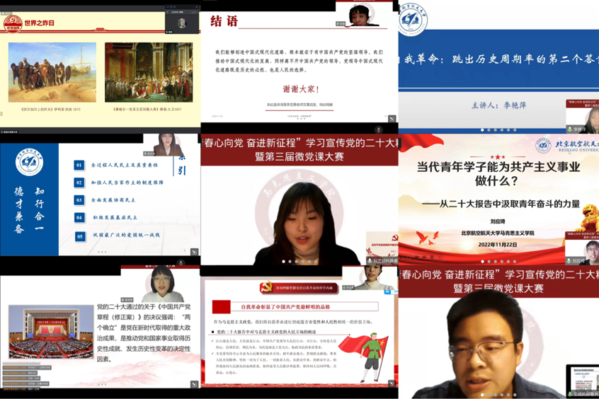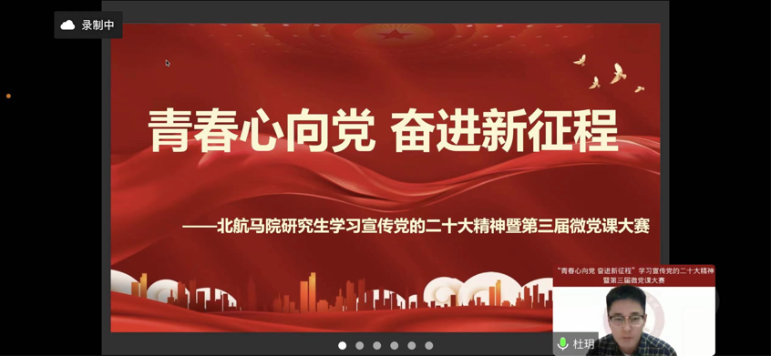 近日,为深入学习贯彻党的二十大精神,进一步学懂弄通做实习近平新时代中国特色社会主义思想,提升研究生的思想理论水平,MG冰球突破官网网站举办的“青春心向党,奋进新征程”学习宣传党的二十大精神暨第三届微党课大赛。副院长陈萌、2022级博士班主任巩永丹、硕士班主任徐冶琼和2021级硕士班主任刘浩然担任比赛评委,参赛研究生通过线上方式进行宣讲展示,全体硕士研究生旁听。比赛由2022级研究生辅导员杜玥主持。