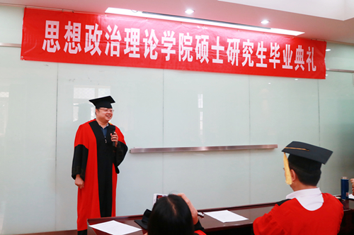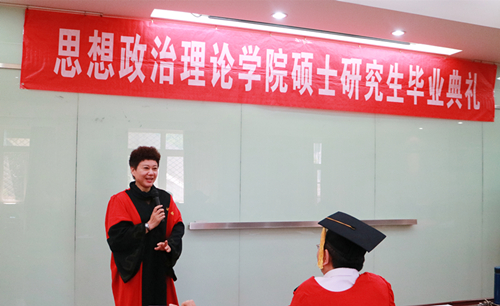 2016年7月1日上午,思想政治理论学院2016届硕士研究生毕业典礼在教学区五号楼202召开。常务副院长姚小玲、副院长赵义良、院长助理高宁及多位老师出席典礼。通过学位论文答辩的14名硕士研究生参加典礼。典礼由研究生指导主任陈萌主持。学院领导及教师代表为毕业生颁发毕业证书。