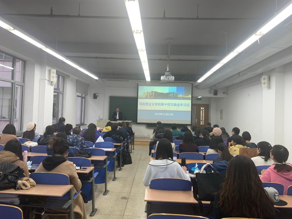 11月13日下午,我院组织开展第十五次集体“学习日”活动,落实中央“不忘初心、牢记使命”主题教育领导小组印发的《关于在第二批“不忘初心、牢记使命”主题教育中认真学习贯彻党的十九届四中全会精神的通知》要求,集中学习党的十九届四中全会精神,研讨如何将《中共中央关于坚持和完善中国特色社会主义制度 推进国家治理体系和治理能力现代化若干重大问题的决定》(以下简称《决定》)融入当前和今后的理论研究、思政课教学、学院治理等具体实践中。活动由我院直属党支部书记高宁和院长助理张树焕主持,60余名师生党员参加。