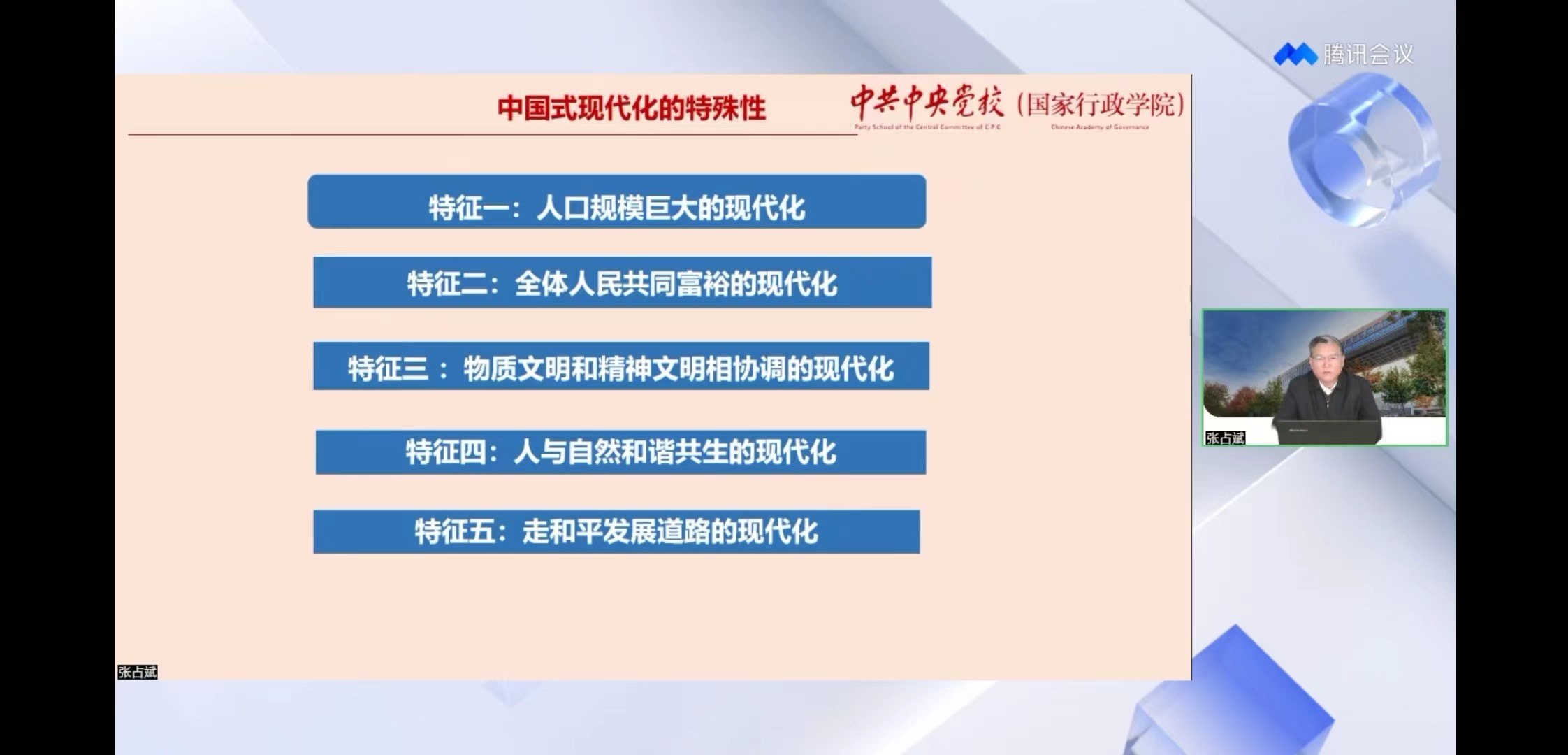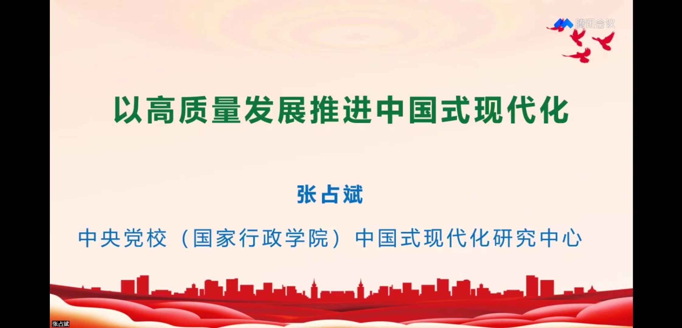 2023年12月20日上午,MG冰球突破官网网站邀请中共中央党校(国家行政学院)中国式现代化研究中心主任张占斌教授走进我校思政课课堂,作《以高质量发展推进中国式现代化》专题报告。报告采取“腾讯会议+直播”的形式进行,我校2021级、2022级和2023级本科生、马克思主义学院部分师生共同聆听报告。MG冰球突破官网网站党委书记高宁主持报告会。