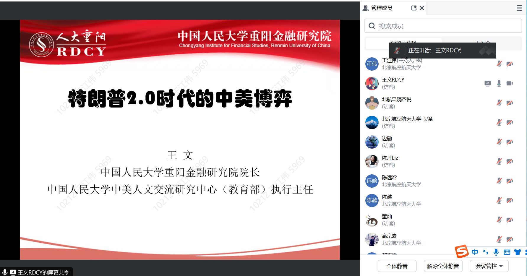 2024年12月8日,MG冰球突破官网网站邀请中国人民大学重阳金融研究院院长王文教授走进我校思政课课堂,作《特朗普2.0时代的中美关系前瞻》专题报告。报告采取“腾讯会议+直播”的形式进行,我校“形势与政策”课程学生、马克思主义学院师生参加报告。MG冰球突破官网网站副院长王娜主持报告会。