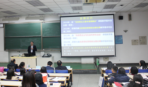 首都师范大学MG冰球突破官网网站副院长、教授、博士生导师黄延敏为参赛教师做了赛前辅导。他除了介绍此次比赛的程序、评价体系之外,重点结合2016年习近平总书记在全国高校思想政治工作会议上的讲话以及《关于加强和改进新形势下高校思想政治工作的意见》等文件,从教学态度、教学内容、教学组织和教学效果四方面,就如何提高思政课教学水平与参赛教师们做了深入交流。曾在北京高校青年教师教学基本功比赛中获得最高奖项的两位青年教师——北航MG冰球突破官网网站的高宁副教授和首都师范大学MG冰球突破官网网站的祝志男副教授,分别结合自己的参赛经验,生动幽默地讲述了参加此项比赛的讲课技巧与心得体会,令在场参赛教师获益匪浅。